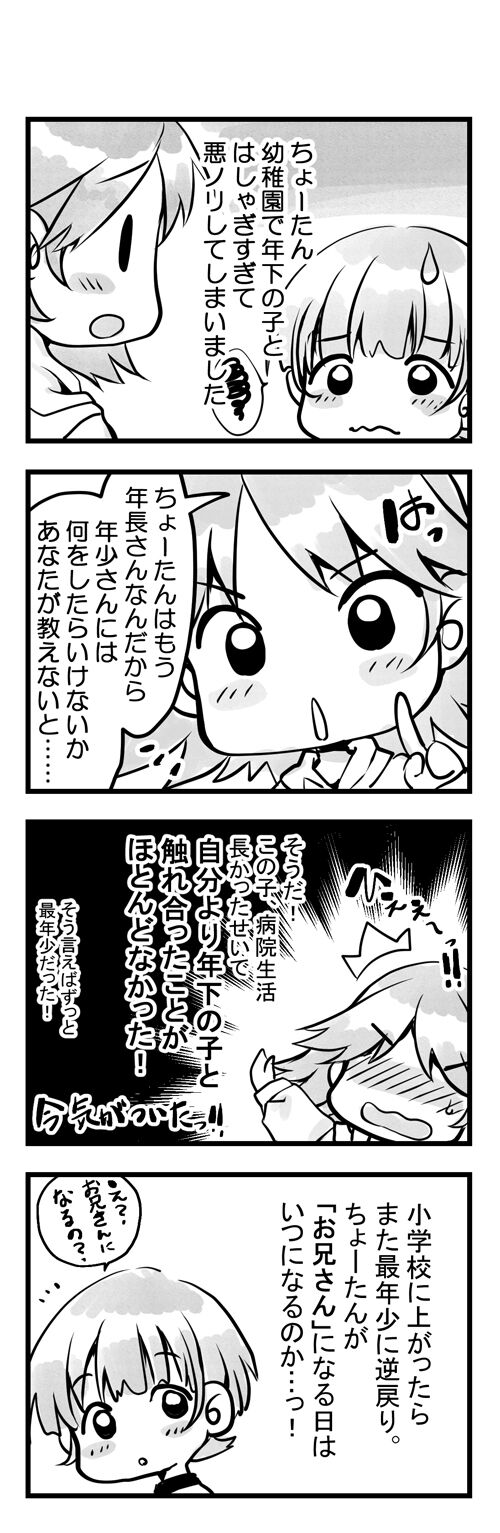 そして、この春で小学校に上がったらまた最年少に逆戻り。ちょーたんには「年下の子には教えてあげないといけないよ」と話しているのですが、なんかピンときていないというか、