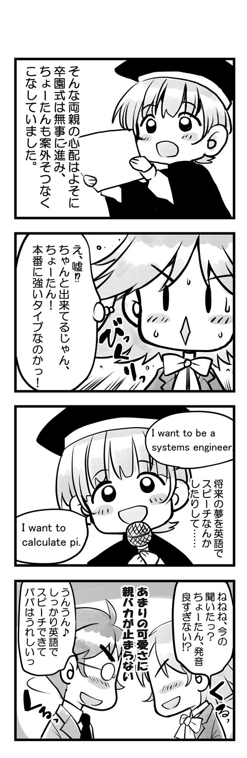 ちょーたん、卒園する!② 2022年04月13日 20:22 ちょーたんが通う幼稚園はインターナショナルなので、子供たちのスピーチも英語だったんです。いやね、もうこれは完全に親バカ視線なんですけど。もう、ちょーたんの発音が良いんですよー!(世界の真ん中で叫びたい)いつの間にそんなに英語がうまくなったんですかー!もう可愛すぎかっ!……とまあ、パパと二人で悶えておりました(笑)。まだもう少し続きますっ。にほんブログ村にほんブログ村にほんブログ村 「ちょーたん(6歳)」カテゴリの最新記事 タグ :#ちょーたん(6歳)#卒園式 < 前の記事次の記事 > コメント コメントフォーム 名前 コメント 記事の評価 リセット リセット 顔 星 情報を記憶 コメントを投稿する