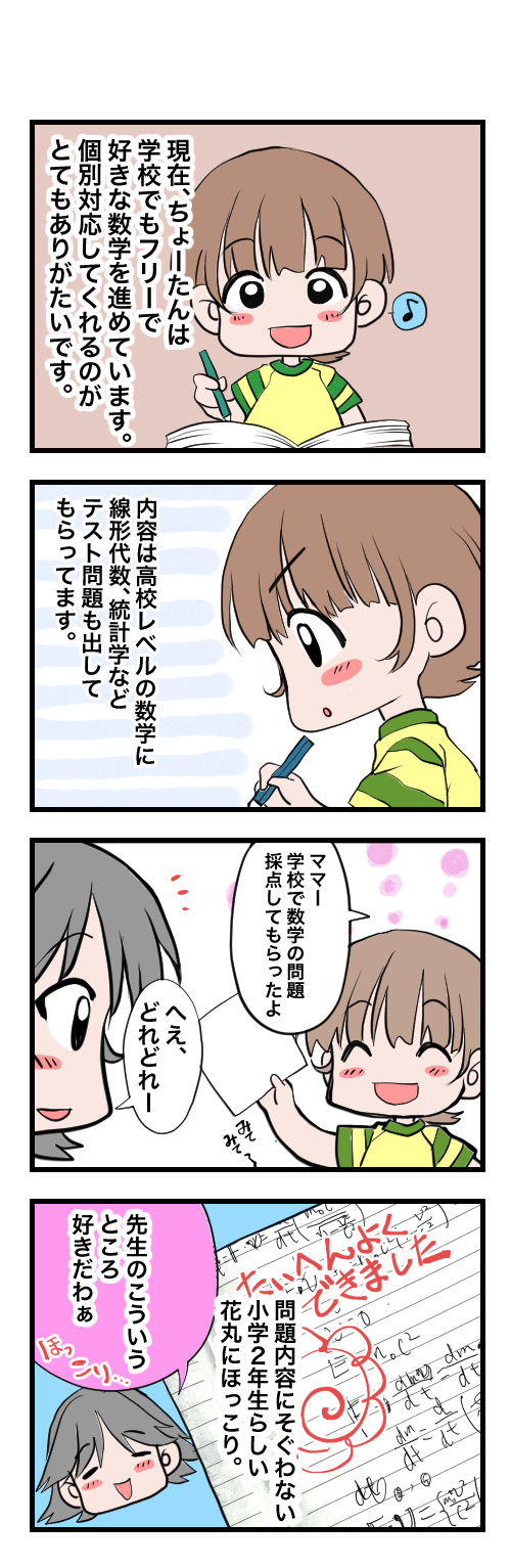 ほっこり花丸 2023年12月23日 21:23 解いている問題の中身は先に進んでいても、まだまだ中身はかわいい2年生。そんなちょーたんにあわせて書いてくださった花丸に、ママの心もほっこりです。学習進度と内面の成長に差がある息子、色々と手がかかるとは思うのですが、こうやって配慮してもらえる学校に行くことができてよかったなぁとしみじみ思います。にほんブログ村にほんブログ村 「ちょーたん(8歳)」カテゴリの最新記事 タグ :#ちょーたん(8歳)#ギフテッド#学校 < 前の記事次の記事 > コメント コメントフォーム 名前 コメント 記事の評価 リセット リセット 顔 星 情報を記憶 コメントを投稿する