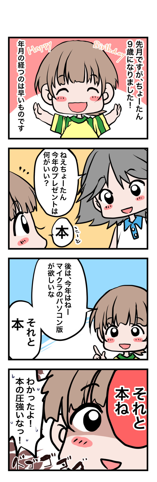 9歳になったよ!! 2024年08月10日 20:21 もう先月の話ですが。ちょーたん9歳の誕生日を迎えてましたー!あんなに小さかったちょーたんが、今やすっかり少年に……と言いたいところですが。チャームポイントの(勝手にそう思っている)プクプクのほっぺは変わらず。そして、やたら本を発するところも!!あまり物欲は強くないちょーたんなので、欲しがるものはいつも本ばかり。今年は統計学の巨大な辞典を希望されました。人を撲殺できそうな厚さの辞典でした……。にほんブログ村にほんブログ村 「ちょーたん(9歳)」カテゴリの最新記事 タグ :#ちょーたん(9歳)#誕生日#本が好き < 前の記事次の記事 > コメント コメントフォーム 名前 コメント 記事の評価 リセット リセット 顔 星 情報を記憶 コメントを投稿する