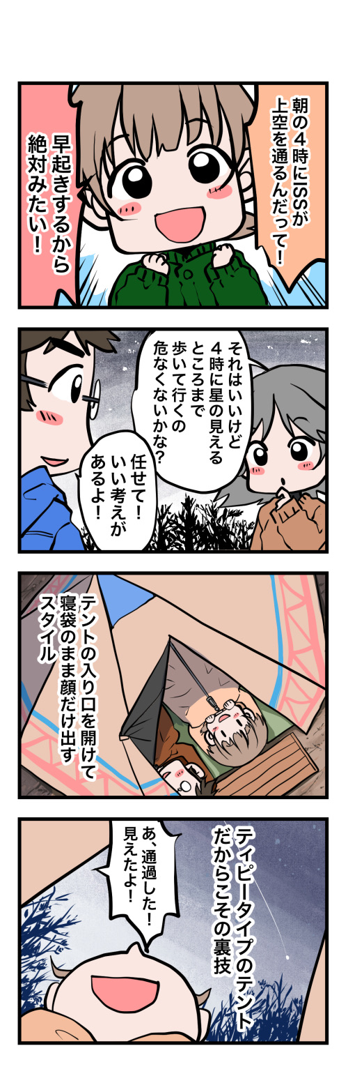 そんなちょーたんのためにパパが考え出したのが、テントで寝ながら夜空を観察するスタイル!